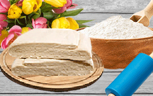 Муку смешать с разрыхлителем и просеять через сито. Добавляя порциями муку в полученную смесь, замесить тесто. Долго месить не надо, закончить, как только тесто соберется в комок.